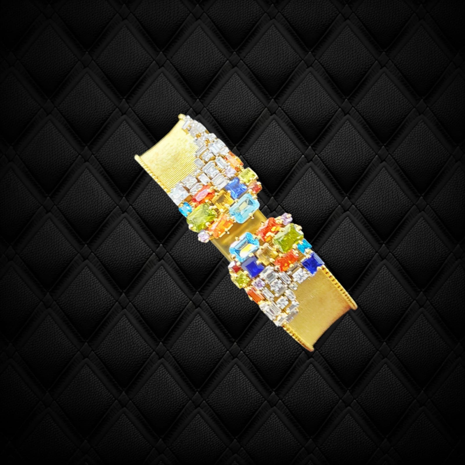 Made with 925KT Silver, the body has texturing on it and the open edges have an interesting play of colored semi-precious stones & crystals